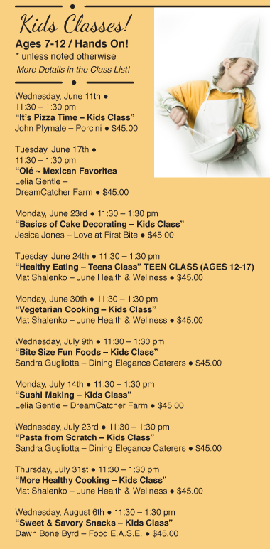 SOLD OUT! Friday, May 23rd ● 6:30 - 8:30 pm ● "Date Night" ● Hands On Class ● David Moeller - Sullivan University ● $90.00 for two Menu: Duck Empanadas with Chipotle Molasses Aioli ● Chicken & Andouille Jambalaya with Black Beans & Rice ● Caramelized Peach Mille Feuille with Bourbon & Brown Sugar Sauce topped with Ice Cream SOLD OUT! Friday, May 30th ● 6:30 - 8:30 pm ● "Date Night" ● Hands On Class ● David Moeller - Sullivan University ● $90.00 for two Menu: Tomato Artichoke Bisque with Basil Pesto ● Pasta with Duck, Caramelized Onions, Spinach, Mushrooms in a Truffle Cream Sauce served with Asiago Cheese ● Lemon Mousse Tartlet with Fresh Berries SOLD OUT! Saturday, May 31st ● 6:30 - 8:30 pm ● "Date Night" ● Hands On Class ● Mike Cunha - Sullivan University & Limestone ● $90.00 for two Menu: Linguini with Roasted Vegetables & Spicy Tomato Sauce ● Seafood Pot Pie topped with a Flaky Pastry Crust ● Lemon Mousse Tarts with Toasted Meringue
