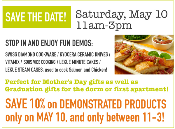 SOLD OUT! Friday, May 9th ● 6:30 - 8:30 pm ● "Date Night" ● Hands On Class ● David Moeller - Sullivan University ● $90.00 for two Menu: Fried Green Tomatoes with Shrimp, Scallops & Crab in a Spicy Creole Sauce ● Seared Pork Loin Chops with Bacon, Roasted Shallots, Apples & Bourbon Sauce and Roasted Vegetables ● Grand Marnier Soufflé